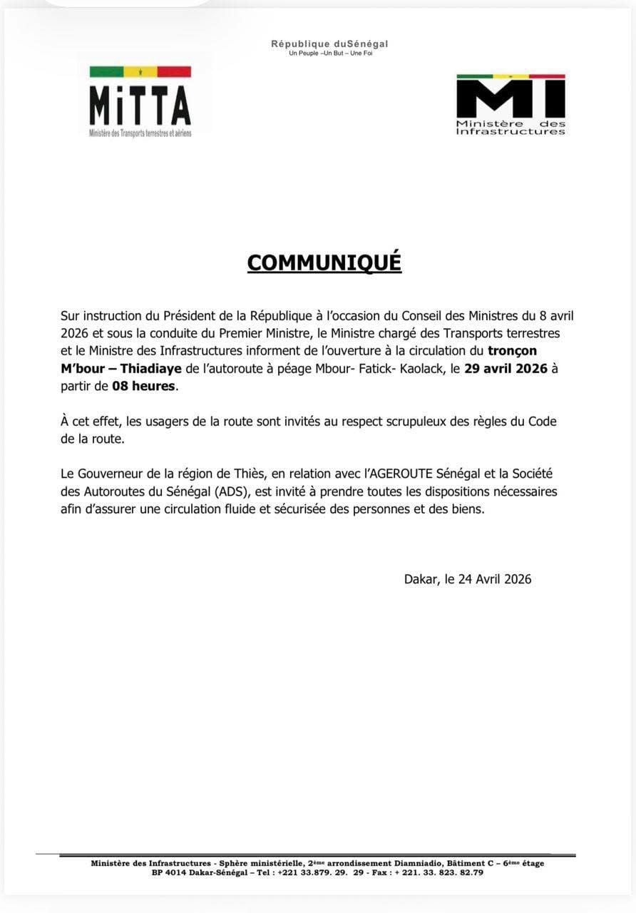 Le tronçon Mbour – Thiadiaye de l’autoroute à péage Mbour-Fatick-Kaolack sera ouvert à la circulation dès le 29 avril 2026, à partir de 08 heures. L’annonce a été faite par le ministère des Infrastructures. «À cet effet, les usagers de la route sont invités au respect scrupuleux des règles du Code de la route», indique le ministère.