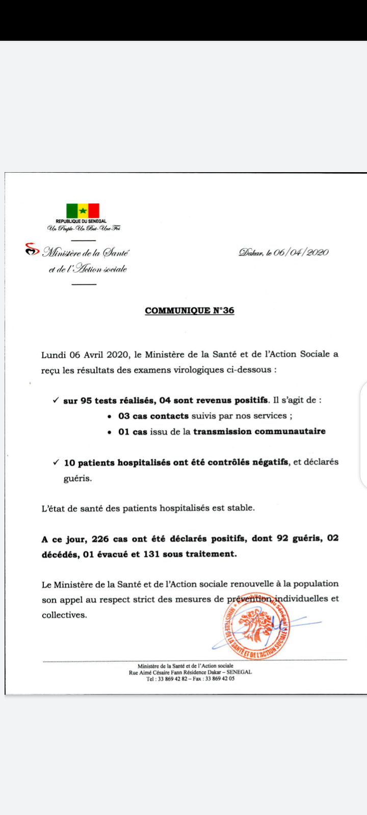 A ce jour 226 cas ont été déclarés positifs au Sénégal 92 guéris, 2 décès, 1 évacué et 131 sous traitement.