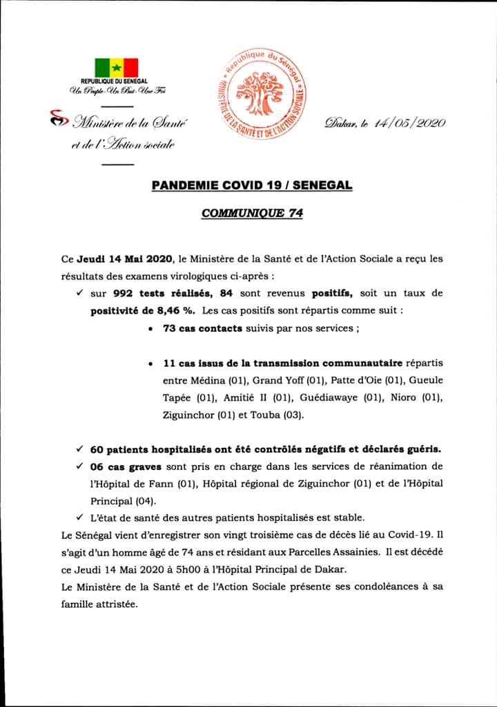 Le Sénégal a enregistré, sur 990 tests effectués, 84 nouveaux cas testés positifs au covid-19 ce jeudi 14 mai 2020. Selon le ministère de la Santé, il s’agit de 73 cas contacts suivis et 11 cas issus de la transmission communautaire répartis entre Médina, Grand Yoff, Patte D’Oie, Gueule Tapée, Amitié, Guédiawaye, Nioro, Ziguinchor et Touba.