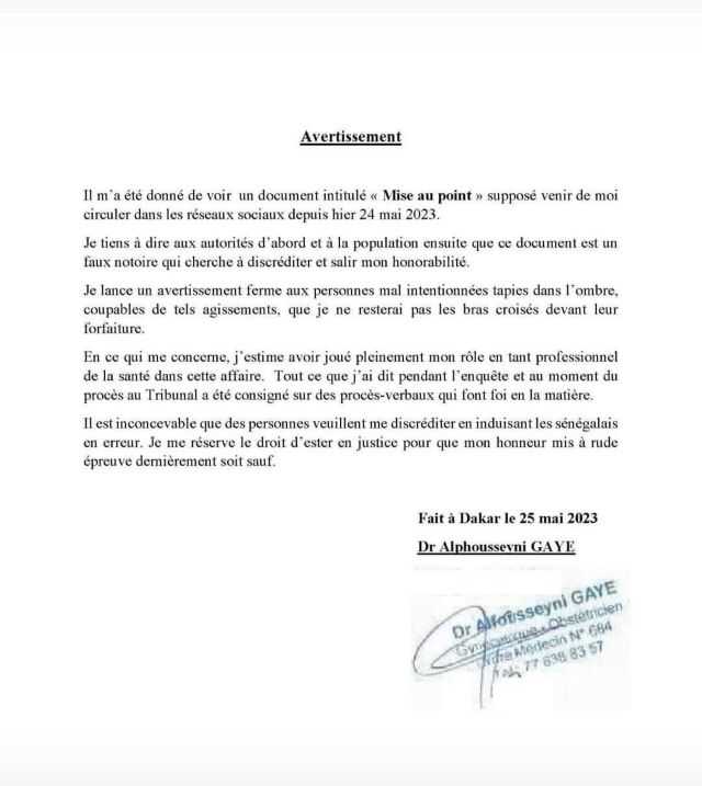 « Le communiqué, sorti hier, émane bien de moi. Je pensais nécessaire de faire ces précisions. Mais s’agissant de celui publié aujourd’hui, c’est vous qui me l’apprenez, d’autant je suis hors de Dakar en ce moment… », confie le gynécologue.