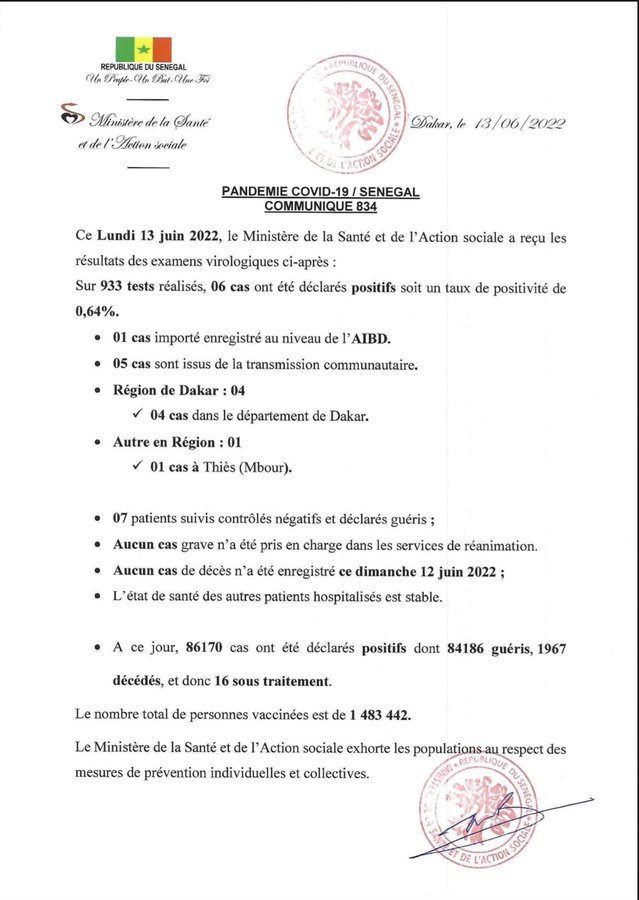 Le ministère de la santé et de l’action sociale a fait le bilan de la pandémie de covid-19 au Sénégal, ce lundi 13 juin 2022. Sur 933 tests effectués, six (6) sont revenus positifs au coronavirus. Les cas positifs se répartissent comme suit : zéro (0) cas contact, un (1) cas importé et cinq (5) cas issus de la transmission communautaire.